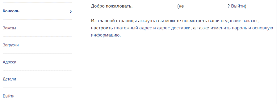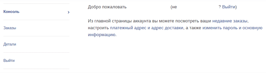 <p><?php /* translators: 1: user display name 2: logout url */ printf( __( 'Вы вошли как <span style="font-size: 19px; letter-spacing: 0.1px; font-weight: 100;">%1$s</span>. <a href="%2$s">Выйти</a>', 'woocommerce' ), '<strong>' . esc_html( $current_user->display_name ) . '</strong>', esc_url( wc_logout_url( wc_get_page_permalink( 'myaccount' ) ) ) ); ?></p> <p><?php printf( __( 'Посмотреть <a href="%1$s">Заказы</a>, отредактировать <a href="%2$s">Личные Данные</a>.', 'woocommerce' ), esc_url( wc_get_endpoint_url( 'orders' ) ), esc_url( wc_get_endpoint_url( 'edit-account' ) ) ); ?></p>