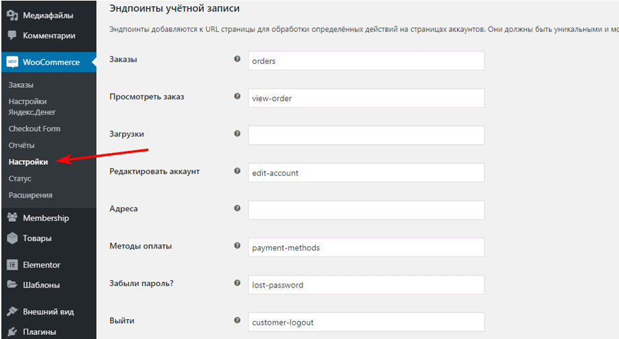 По умолчанию в админке WooCommerce есть несколько эндпоинтов, которые находятся в WooCommerce — Настройки — Дополнительно — Эндпоинты учётной записи: