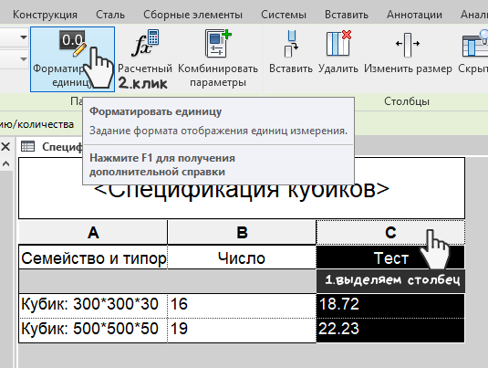 Давайте рассмотрим детально как это произошло. Параметр «Тест» у всех элементов имел значение единицы. В первоначальном виде, когда мы настроили группировку по семейству и типоразмеру и не выбрали «Вычислять итоги» во вкладке «Форматирование», в спецификацию выводилось значение этого параметра. То есть, если у Кубика 300х300 значение было «1», то в спецификацию и выводилась «1». И все равно, что таких кубиков 16.