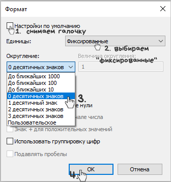 После открытия снимаете галочку с «Настройки по умолчанию». Выбираете тип единицы «Фиксированные». Далее задаете величину округления «0 десятичных знаков». Таким образом, у вас получится округлять значения согласно математическим правилам.