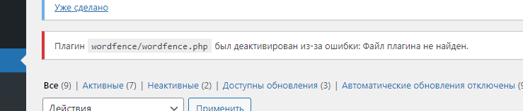 После того, как попаду в админку сайта, то в разделе плагины увижу оповещение о том, что плагин деактивирован из-за ошибки.