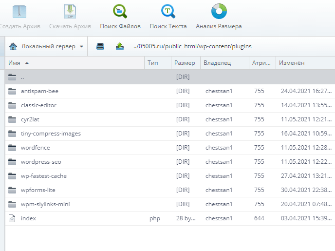 Заходим на свой хостинг и дальше направляемся в управление файлами сайта. Там я нахожу папку в которой и лежат все мои установленные плагины. На моём хостинге путь к этой папке выглядит так (название сайта/wp-content/plugins).