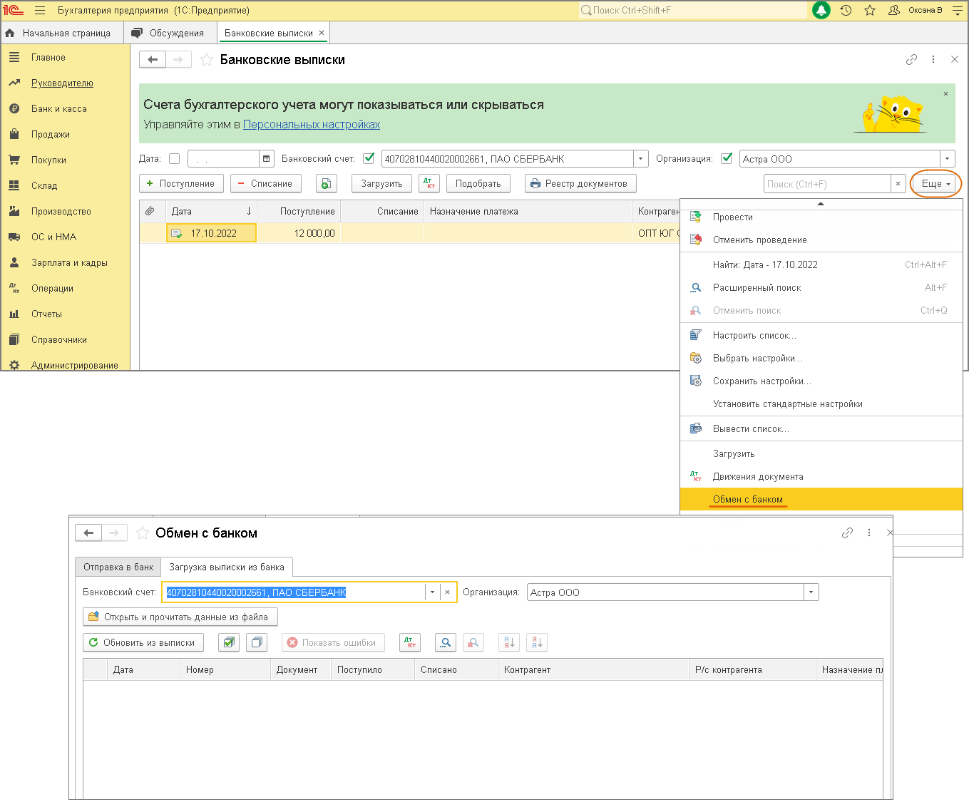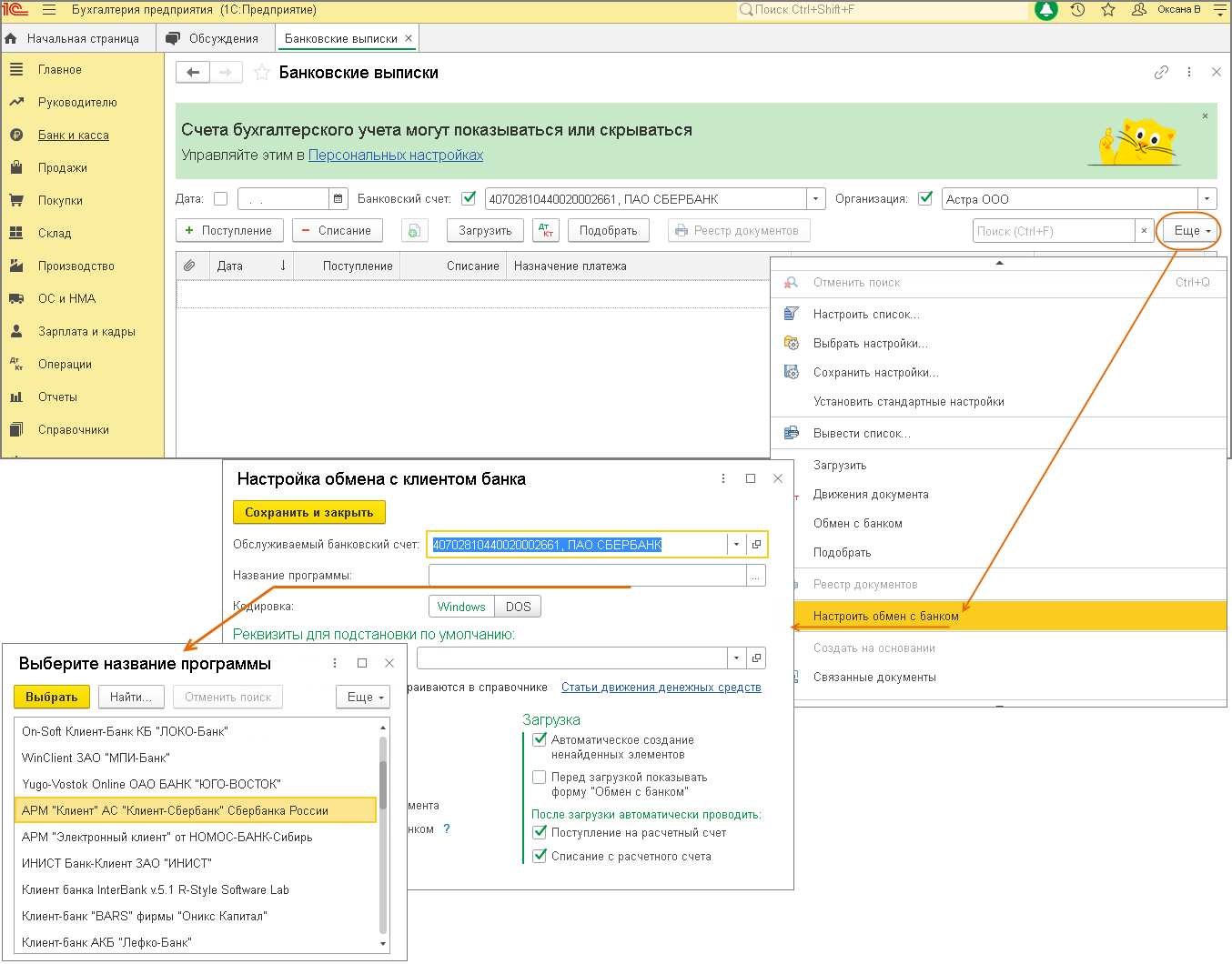 - По кнопке «Еще» выберите «Настроить обмен с банком». В открывшемся окне «Настройка обмена с клиентом банка» выберите: