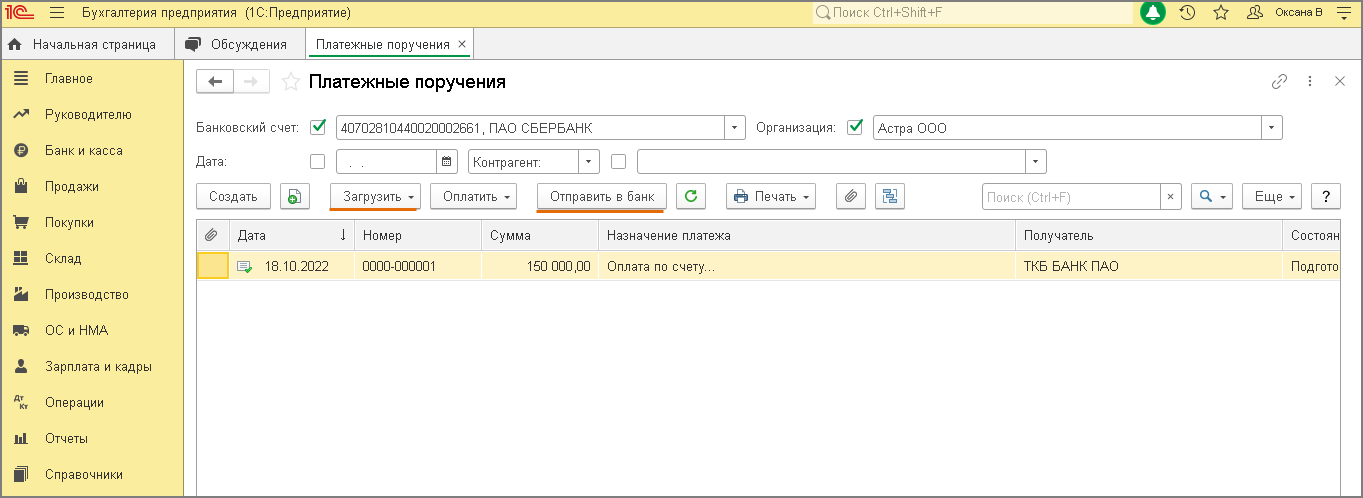 Загрузку и выгрузку файла данных в/из системы «Клиент-банк» можно выполнять как в разделе Банк и касса – Платежные поручения (по кнопкам «Загрузить» и «Отправить в банк» соответственно) (рис. 2), так и в разделе Банк и касса – Банковские выписки (по кнопке «Загрузить» или по кнопке «Еще» – команда «Обмен с банком» (рис. 3 — 4).