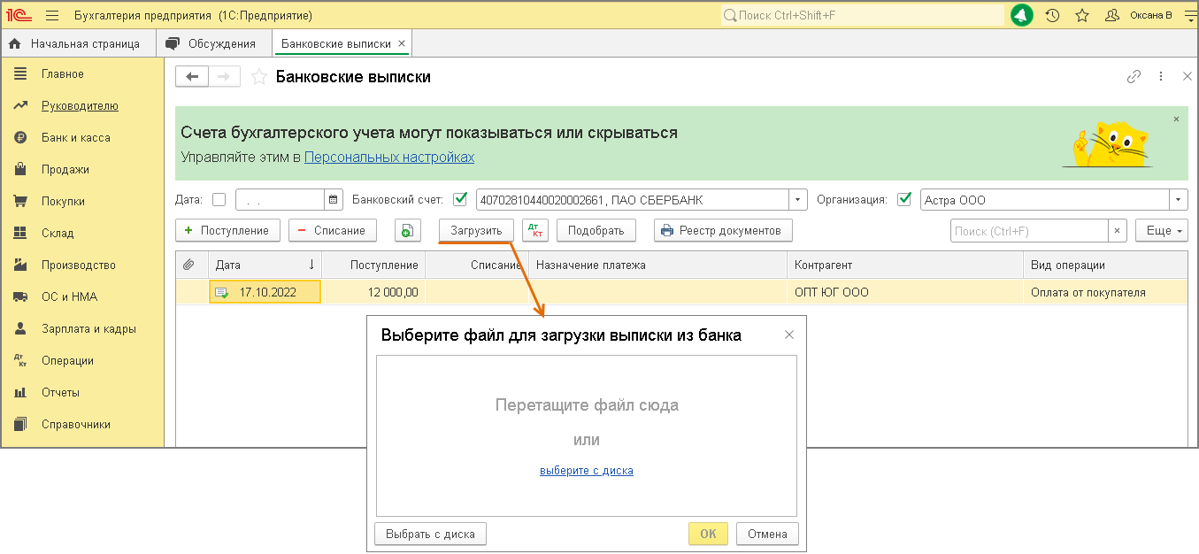 - Раздел: Банк и касса – Банковские выписки.